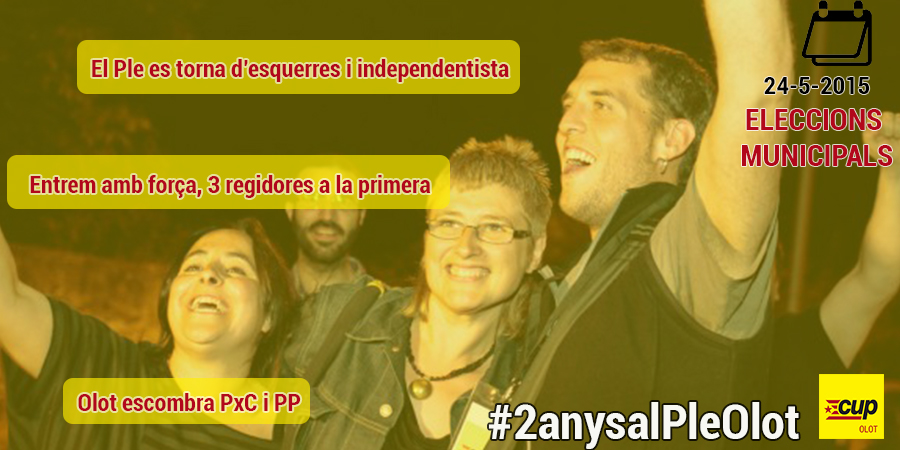 Ara fa dos anys, la CUP Olot entrava amb força a l'Ajuntament d'Olot. Presentant-nos per primera vegada, obtenim 3 regidores i 1.524 vots a la ciutat. Ara que som a l'equador del mandat de 4 anys que ens van donar els i les ciutadanes, toca fer la vista enrere per seguir avançant. És per això que el proper 27 de maig hem preparat un acte per debatre de com han anat aquests dos primers anys i, sobretot, de com volem/voleu que vagin els dos següents. Utilitzarem l'etiqueta: #2anysalPleOlot