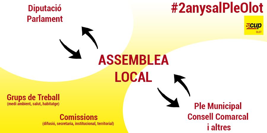 Ara fa dos anys, la CUP Olot entrava amb força a l'Ajuntament d'Olot. Presentant-nos per primera vegada, obtenim 3 regidores i 1.524 vots a la ciutat. Ara que som a l'equador del mandat de 4 anys que ens van donar els i les ciutadanes, toca fer la vista enrera per seguir avançant. És per això que el proper 27 de maig hem preparat un acte per debatre de com han anat aquests dos primers anys i, sobretot, de com volem/voleu que vagin els dos següents. Utilitzarem l'etiqueta: #2anysalPleOlot
