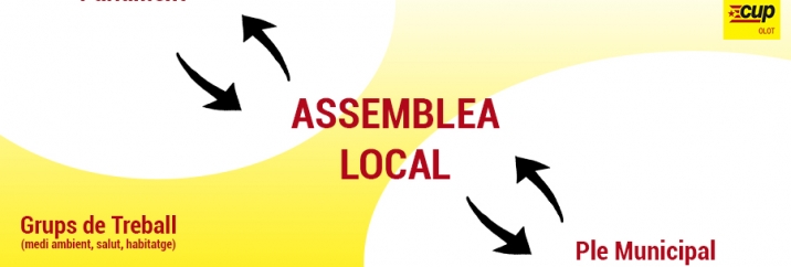 La base de la CUP és l'Assemblea Local que es reuneix quinzenalment i és on es prenen totes les decisions que afecten a la CUP d'Olot. També és el lloc on les diferents Comissions o Grups de Treball exposen tot allò que van treballant i elaborant a l'Assemblea Local per a la seva aprovació. De Grups de Treball actualment tenim en marxa els de Medi Ambient, Salut i Habitatge i de Comissions les de Difusió, Secretaria, Institucional i Territorial.