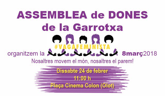 Els grups d'OeC i ERC presenten una moció que només dóna suport a les "mobilitzacions" convocades pels sindicats majoritaris, aturades parcials de dues hores. Ens hi mostrem en contra, nosaltres donem suport a la convocatòria de vaga general feminista convocada per col·lectius feministes d'arreu, no a un succedani per rentar-se la cara. Vam acabar recordant que aquest proper dissabte a les 11h del matí hi ha convocada una assemblea de dones de La Garrotxa per organitzar la vaga, convidem a totes a assistir-hi.